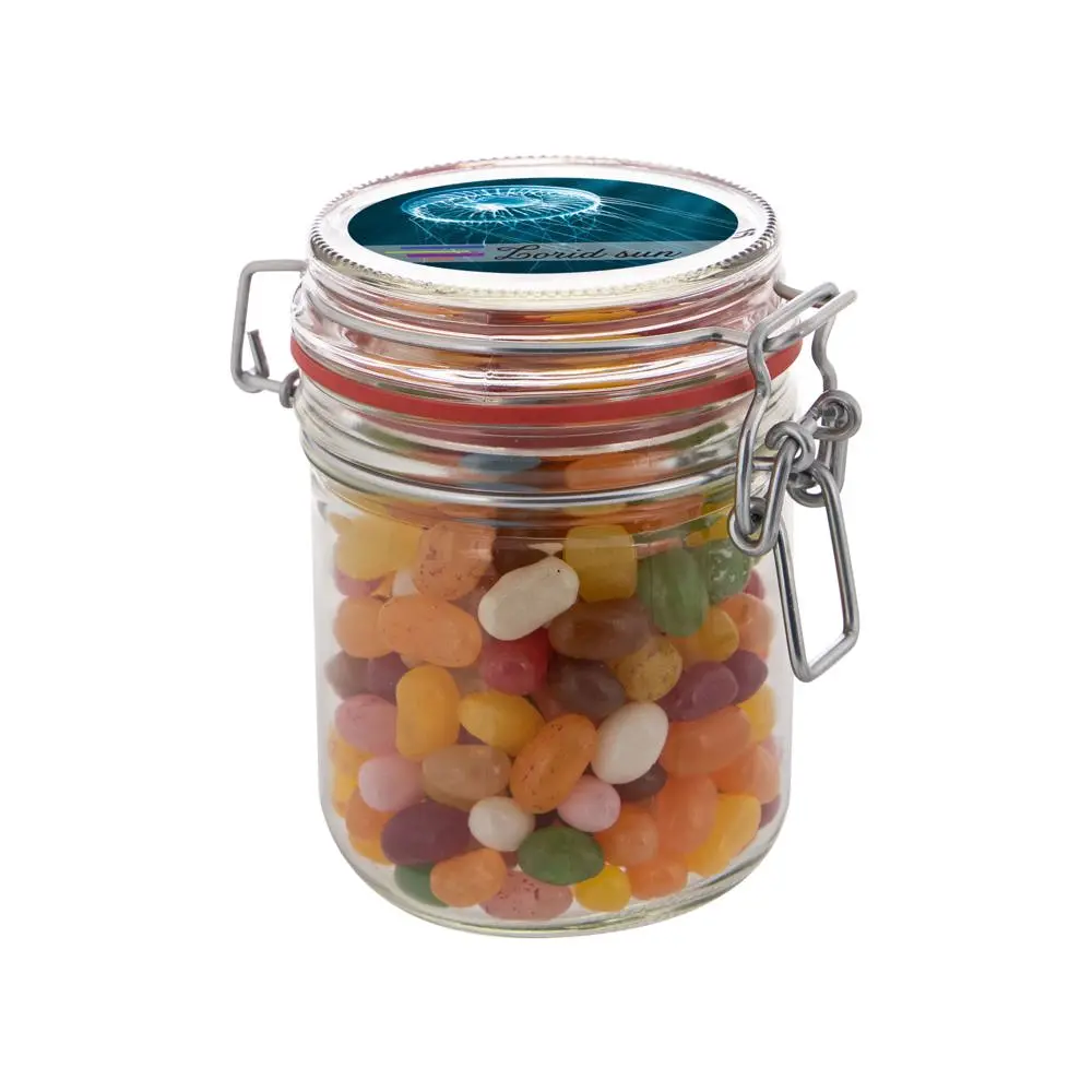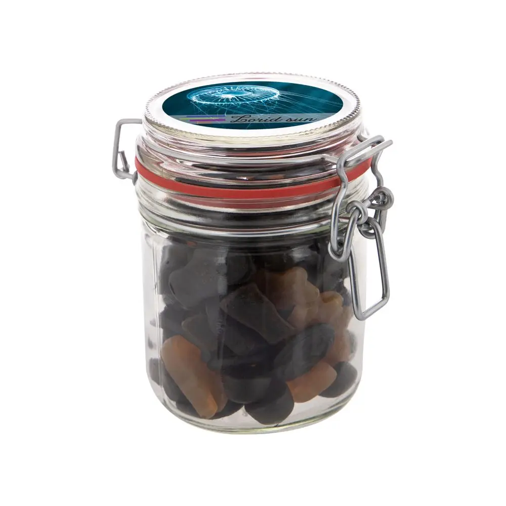 Ontdek ons weckpotje van 0,4 liter, vervaardigd uit stevig glas met een diameter van 75 mm. Dit potje is gevuld met ongeveer 140 gram smakelijke snoepjes, wat het een aanlokkelijk geschenk maakt voor uw klanten en relaties.