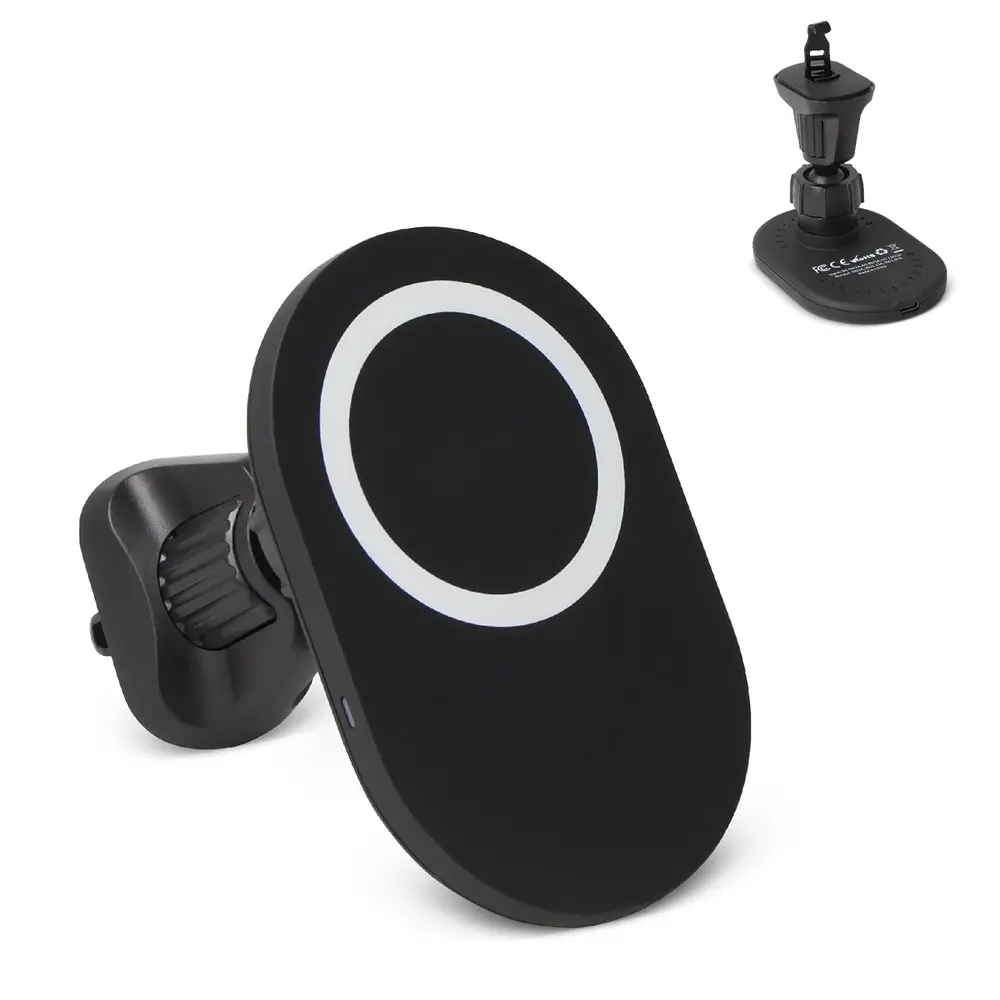 Ontdek deze innovatieve 15W magnetische draadloze autolader, ideaal als gepersonaliseerd relatiegeschenk voor uw bedrijf. Volledig compatibel met het MagSafe-ecosysteem van Apple, en uitgerust met een magnetische pad voor andere smartphones. U klikt uw toestel eenvoudig vast voor een naadloze oplaadervaring tijdens het rijden.