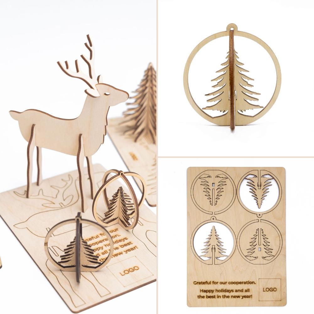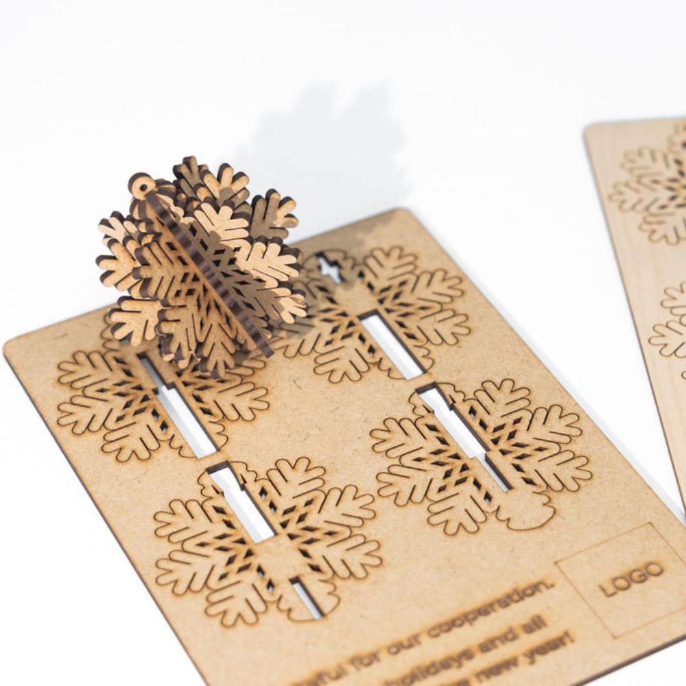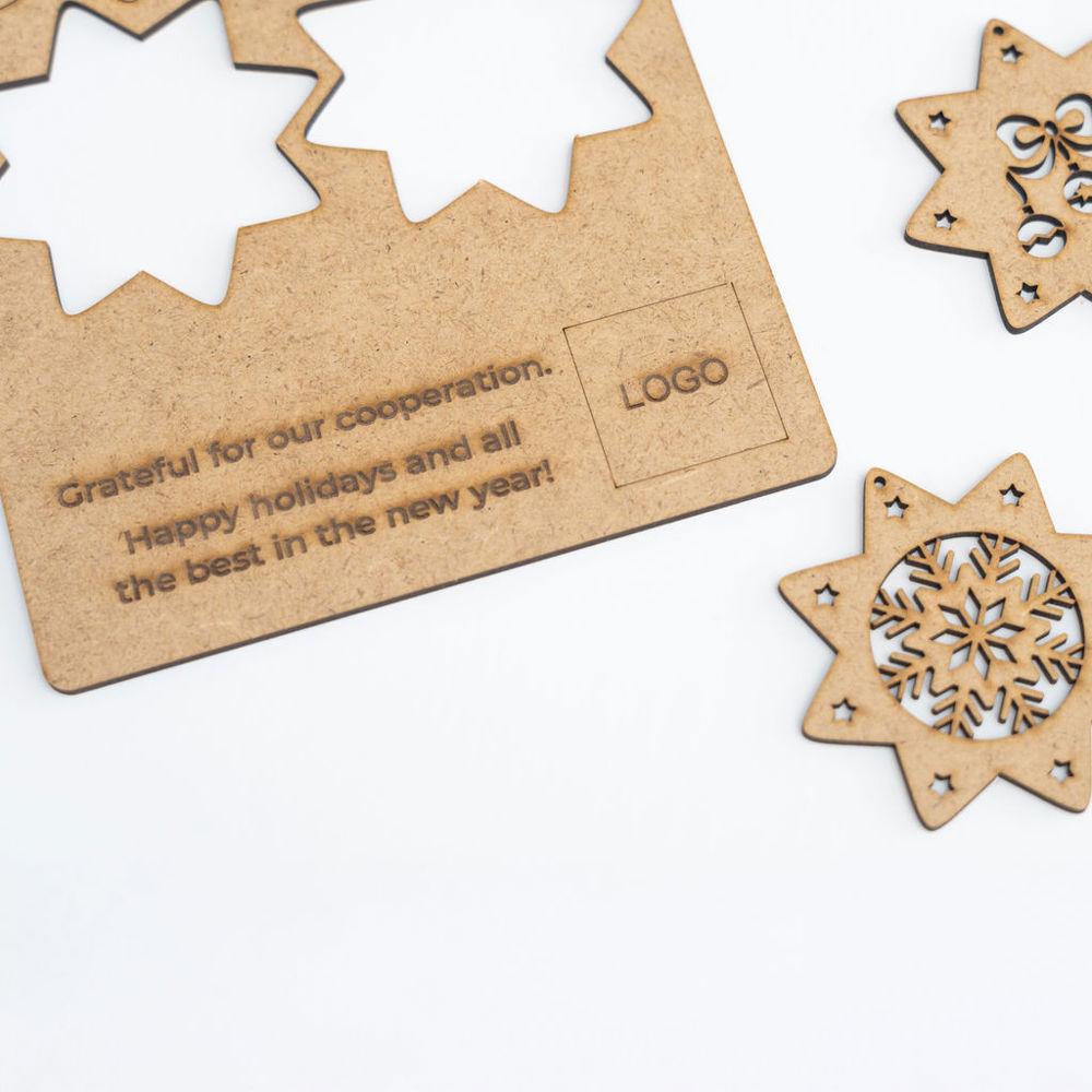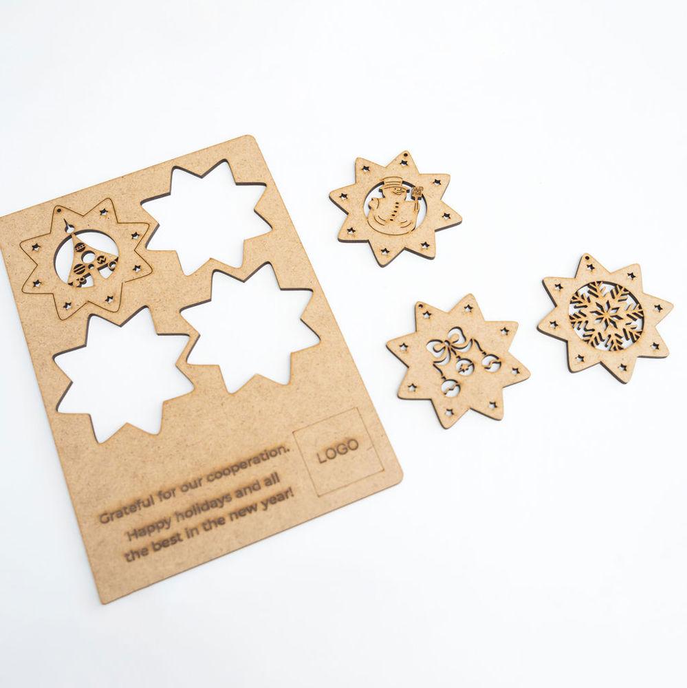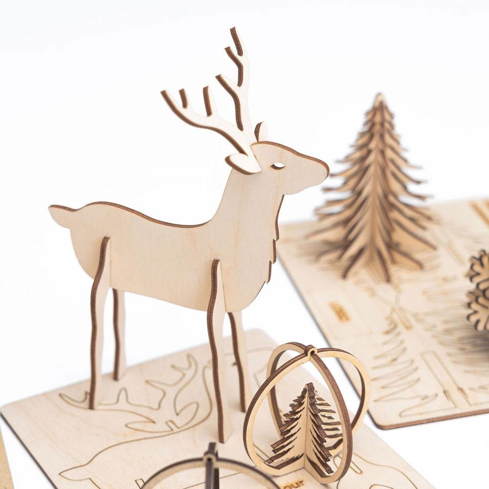 Wooden Wish – Houten kerstkaart met versieringen, puzzel, figuur