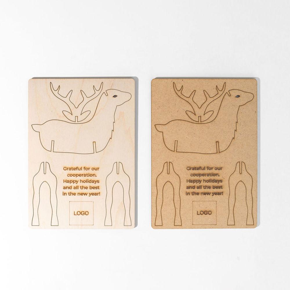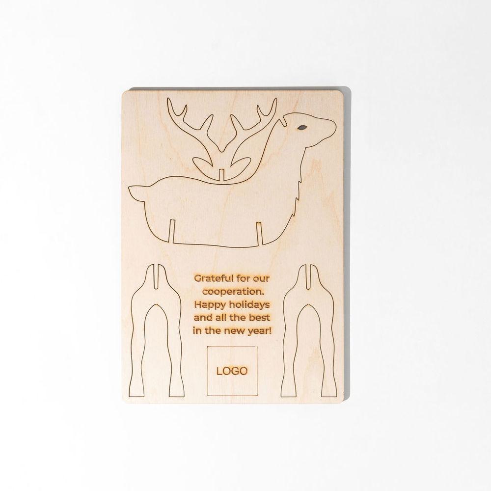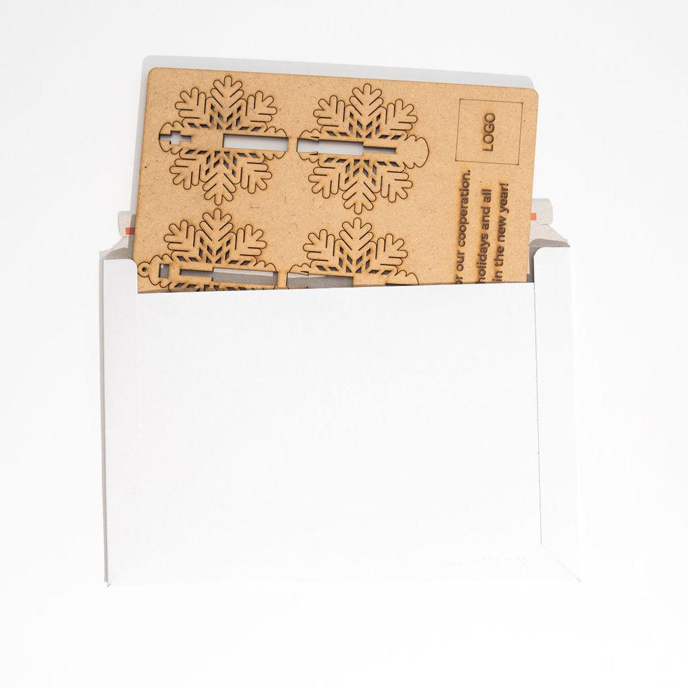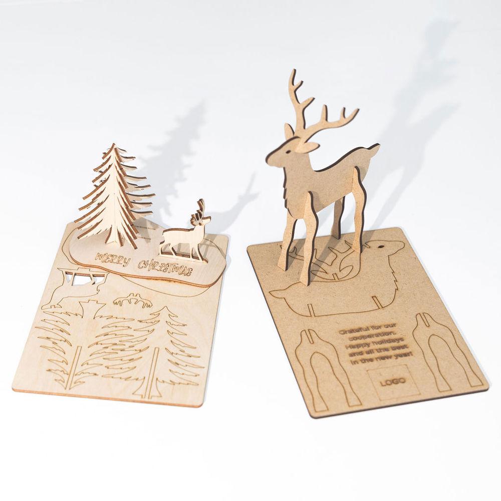Deze houten wenskaarten veranderen een eenvoudige groet in een duurzaam en blijvend aandenken. Gemaakt van hoogwaardig hout met precisie laser-snede, zijn ze in A5-formaat en meer dan een kaart: je stelt er figuren mee samen zoals rendieren, sneeuwpoppen, kerstversieringen, je logo of een eigen vorm. Verpakt in een kartonnen envelop, combineren ze elegantie, duurzaamheid en langdurige zichtbaarheid voor je merk.