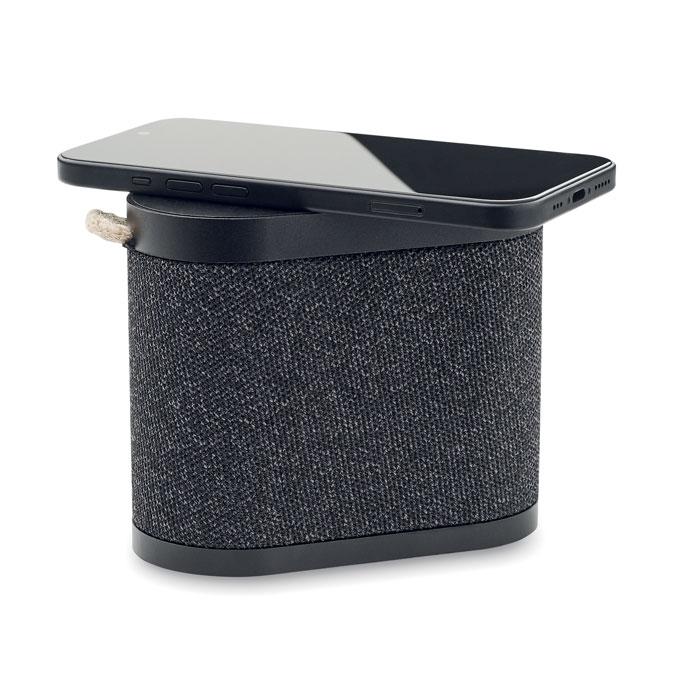 5.3 draadloze luidspreker in ABS met RPET polyester stof afwerking en bamboe 15W draadloze oplader aan de bovenkant, met jute hengsel. 1 oplaadbare Li-Ion 1200 mAh batterij. Uitgangsgegevens: 5W, 4 Ohm en 5V. Speeltijd ca. 4 uur.
