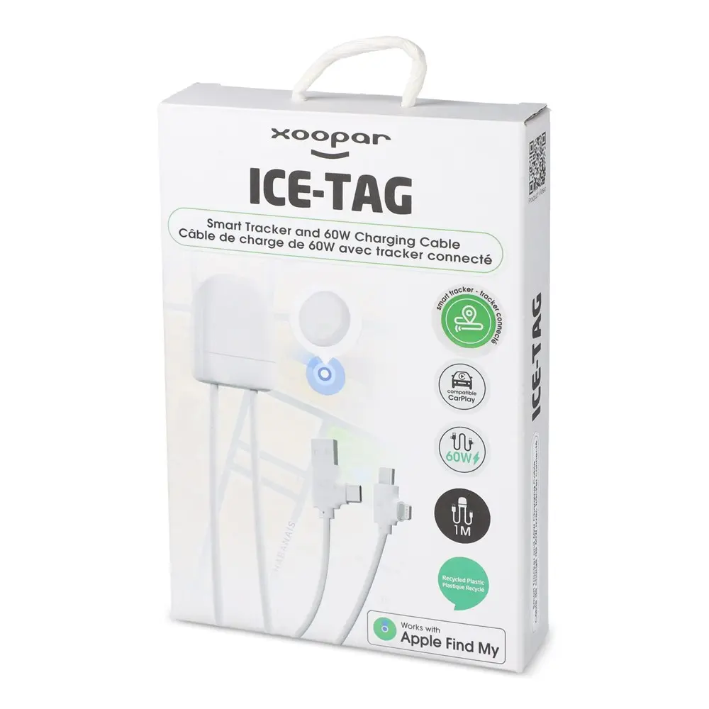 Ontdek de Xoopar Ice-Tag laadkabel met tracker - Find My, een innovatieve oplaadkabel van 1 meter die naadloos integreert met de Apple Find My-functie. Via iOS-apparaten lokaliseert u moeiteloos uw eigendommen, ideaal voor gebruik in de auto of op events. De dubbele invoerpoorten (USB-A en Type-C) en uitvoerpoorten (Lightning en Type-C) maken deze kabel veelzijdig voor al uw apparaten, inclusief ondersteuning voor CarPlay en snelladen tot 60 W.