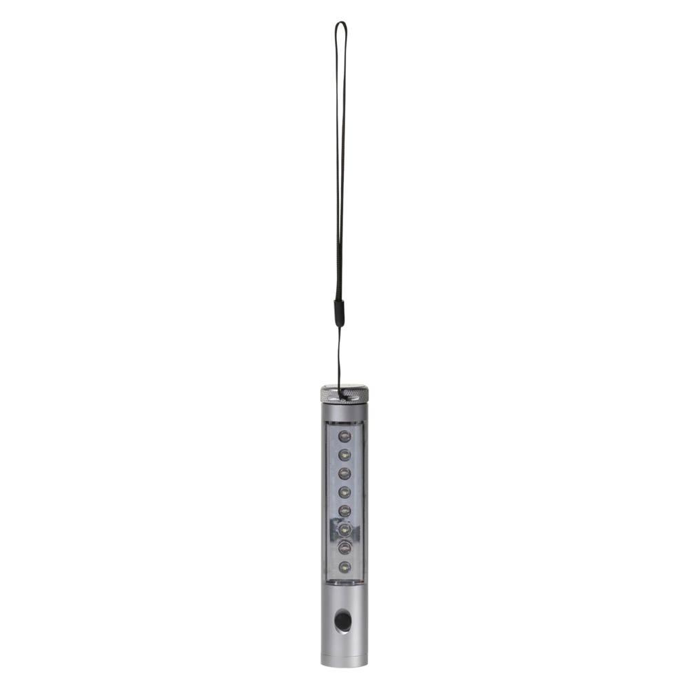 Aluminium zaklamp met LED verlichting aan de voorzijde en de zijkant. In te stellen op continu of knipperlicht. Achterzijde voorzien van magneet. Wordt inclusief polsband en batterijen geleverd. In geschenkverpakking verpakt.