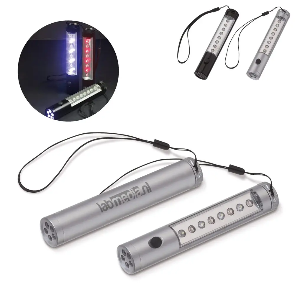 Ontdek deze robuuste aluminium zaklamp met LED-verlichting aan de voorzijde en zijkant. U kunt de verlichting instellen op continu licht of knippermodus voor optimale zichtbaarheid. De achterzijde is uitgerust met een sterke magneet, ideaal voor bevestiging aan metaaloppervlakken. De zaklamp wordt geleverd inclusief polsband voor eenvoudig dragen en batterijen voor direct gebruik. Alles zit verpakt in een aantrekkelijke geschenkverpakking, perfect voor uw promotionele doeleinden.